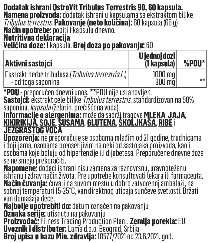 Jedna kapsula vas snabdeva sa 1000mg najkvalitetnjeg Tribulus Terrestris ekstrakta – standardizovanog na 90% steroidnih saponina.