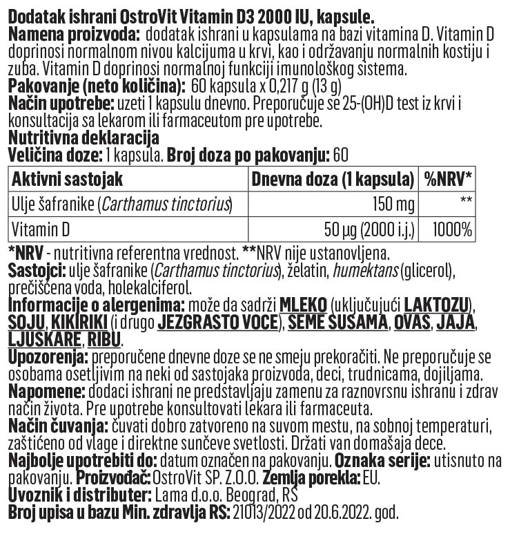 OstroVit Vitamin D3 2000 IU je visokokvalitetan dodatak ishrani, koji je izvor vitamina D3.