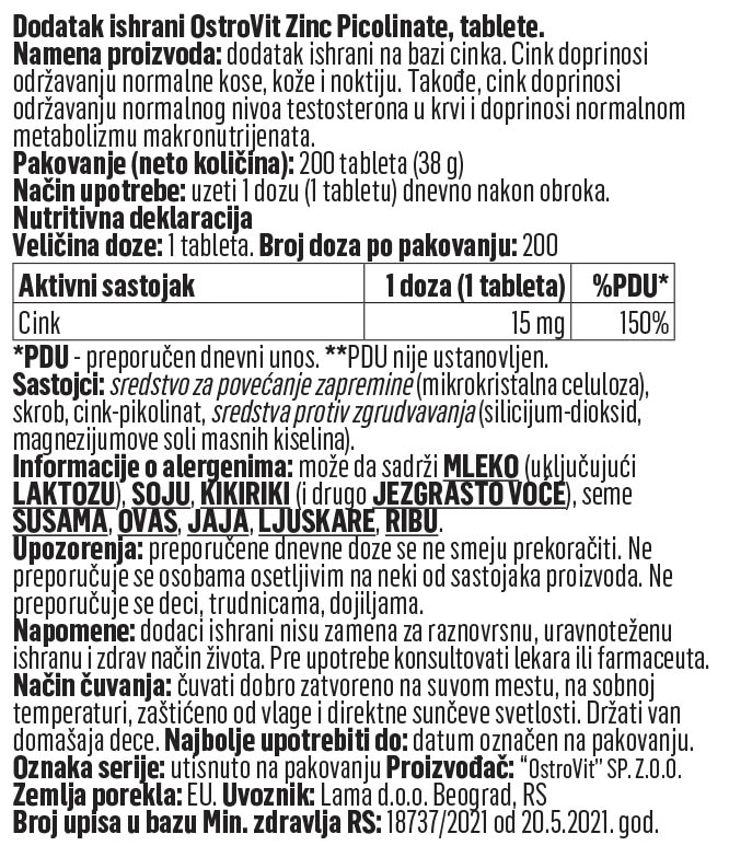 - Izvor cinka – jedna porcija dijetetskog suplementa obezbeđuje telu 15 mg elementa u visoko bioraspoloživom obliku cink pikolinata.