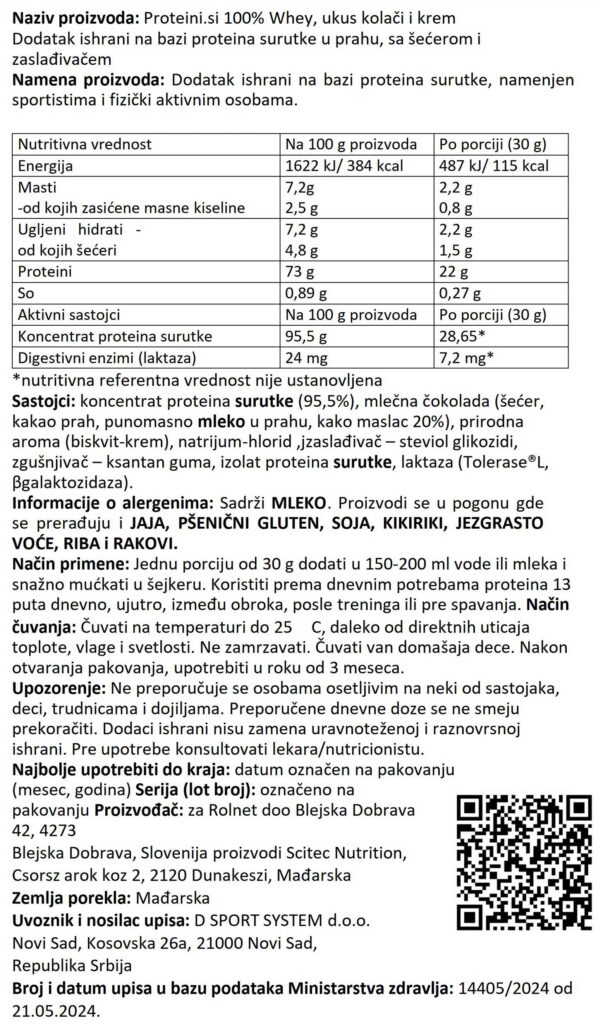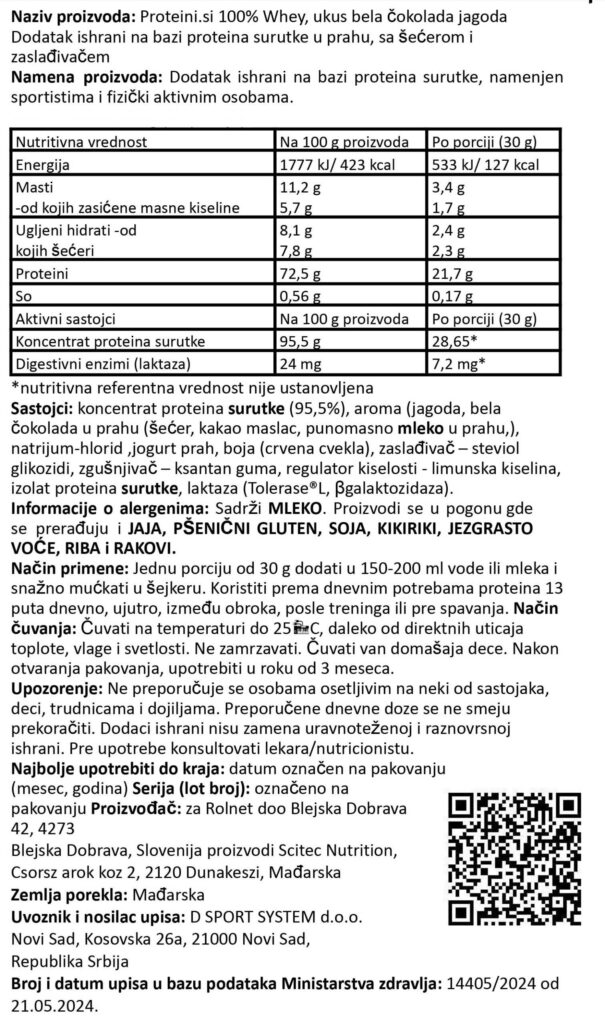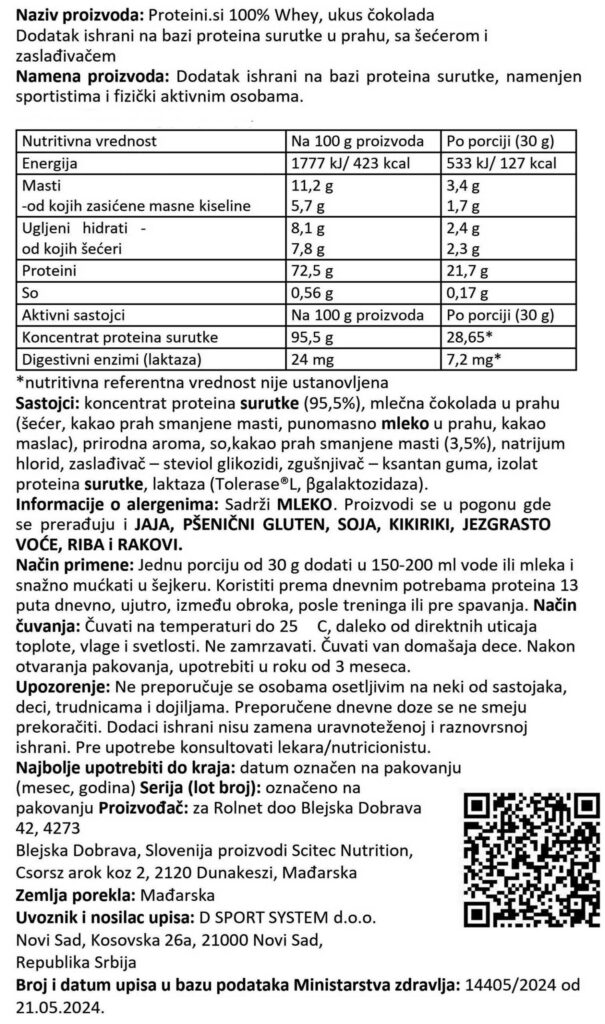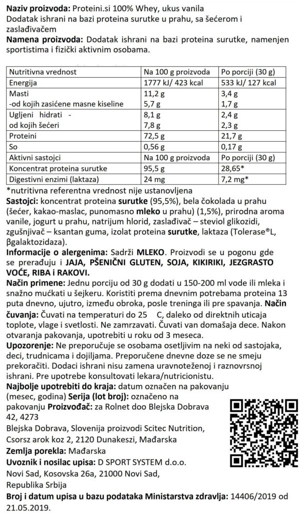 Nutritivna vrednost za PROTEINI.SI 100% NATURAL WHEY PROTEIN, 400g