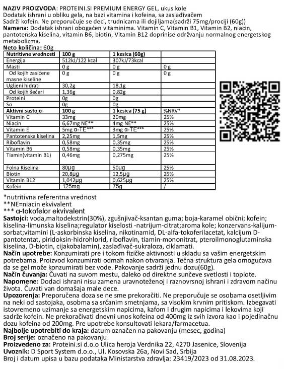 Nutritivna vrednost za PROTEINI.SI PREMIUM ENERGY GEL, 60g, Cola (sa kofeinom)