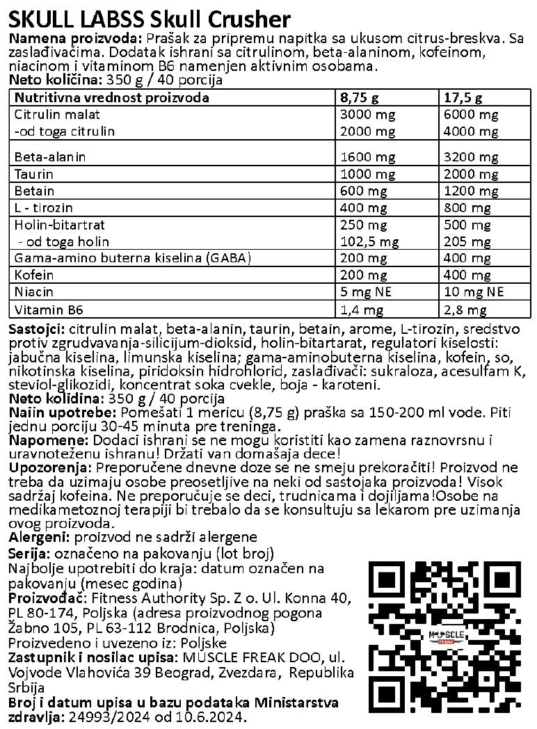 Više snage, bolja pumpa, jači treninzi i brzi oporavak nudi Skull Crusher.Formula sadrži čak 12 aktivnih komponenti, koje sadrze velike doze i u idealnoj su srazmeri. Sirovine su dobijene iz vrhunskih, i proverenih izvora.Sastav je kombinacija NO pojačivača, stimulansa, nootropnih sastojaka i B vitamina.Dobro osmišljena formula garantuje pravu potporu tokom napornih vežbi snage i izdržljivosti te će vam pomoći u postizanju vaših ciljeva.Pogodan je za sve od početnika (koji obavezno trebaju koristiti pola doze nikako punu dozu prvi put) pa sve do profesionalaca kako bi iz svojih treninga izvukli maksimum.