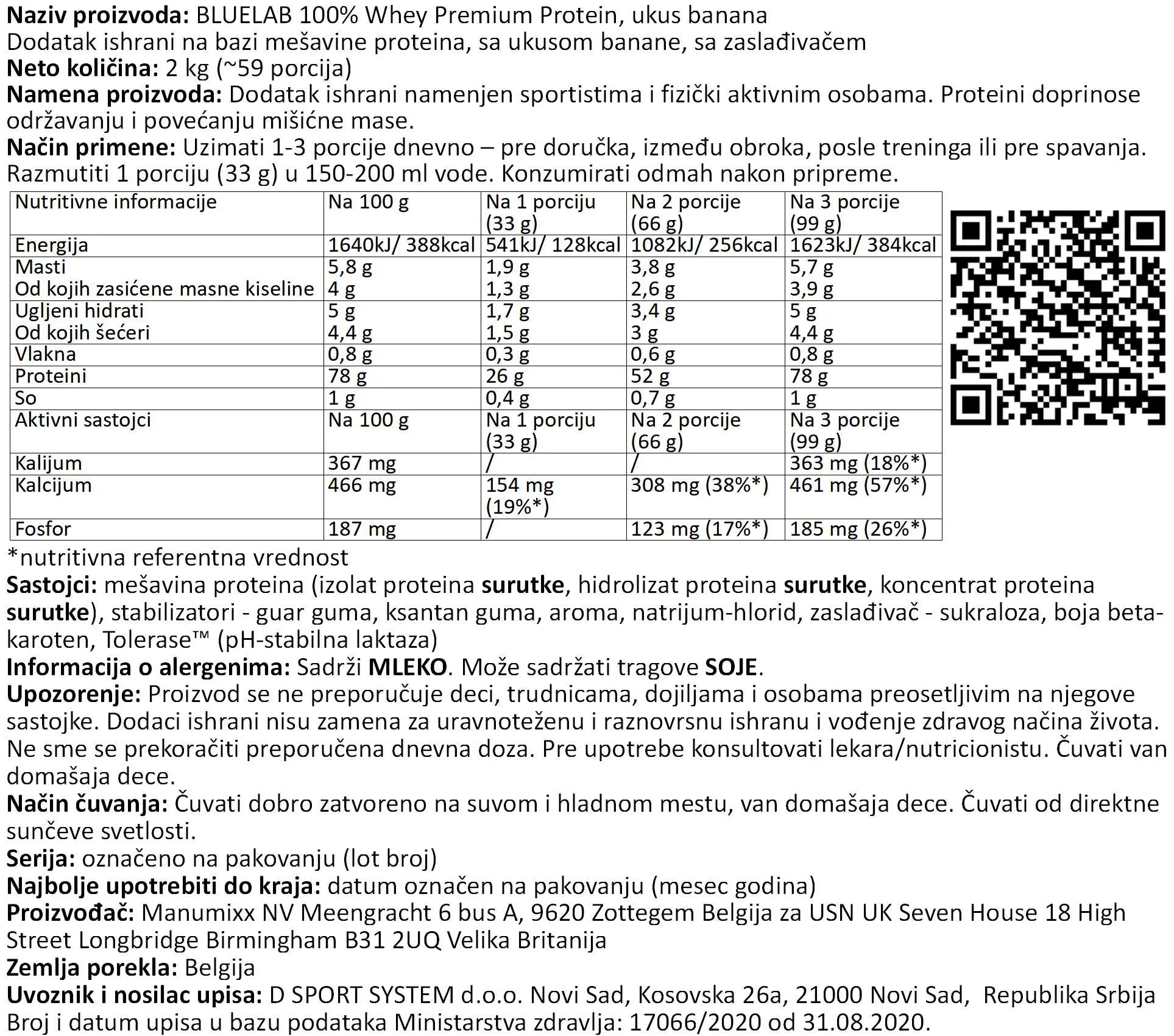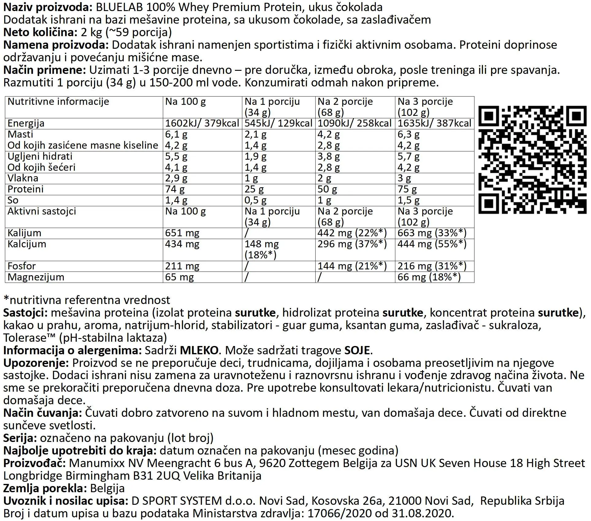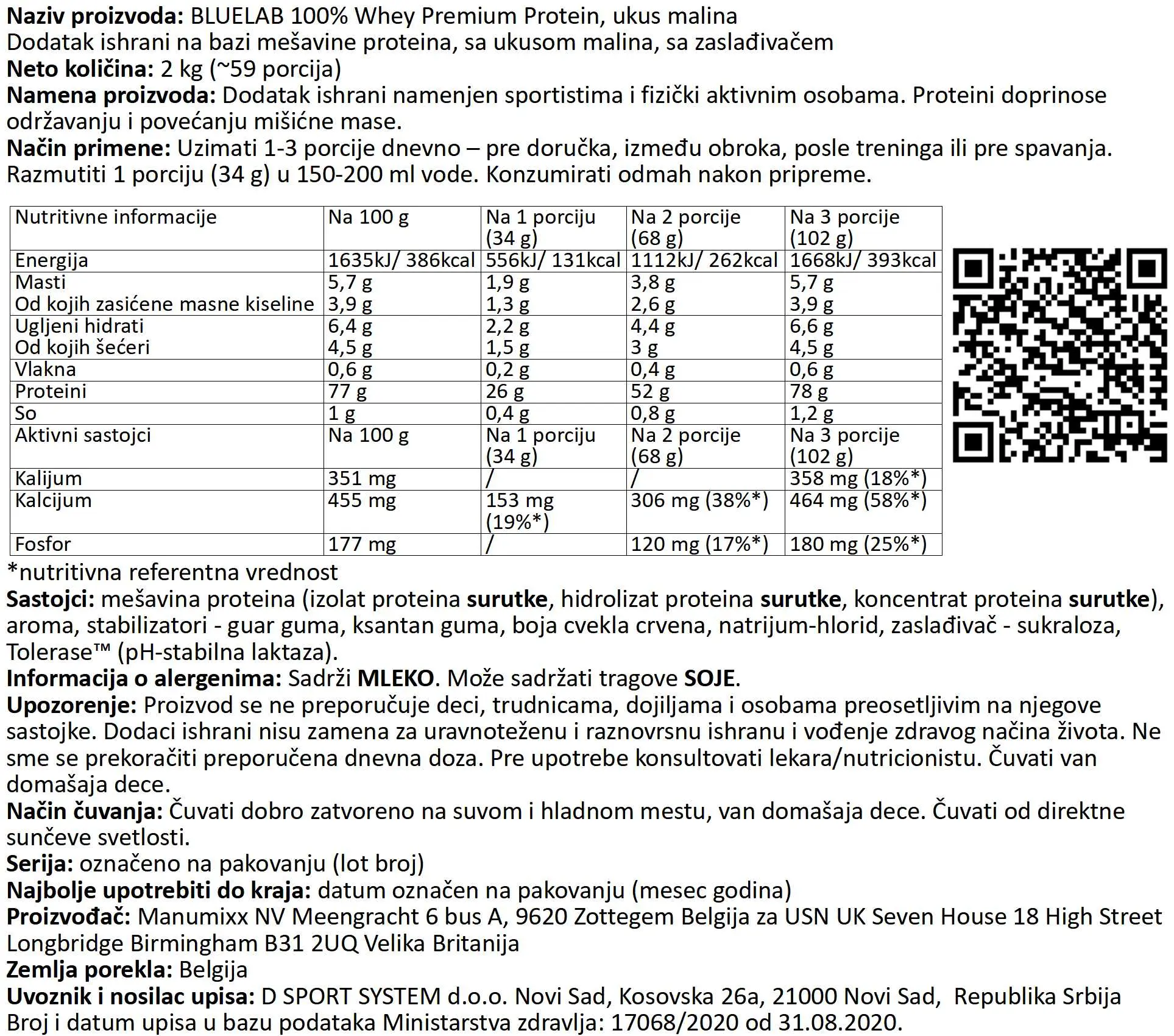 Nutritivna vrednost za USN BLUE LAB 100% WHEY PROTEIN, 2000g