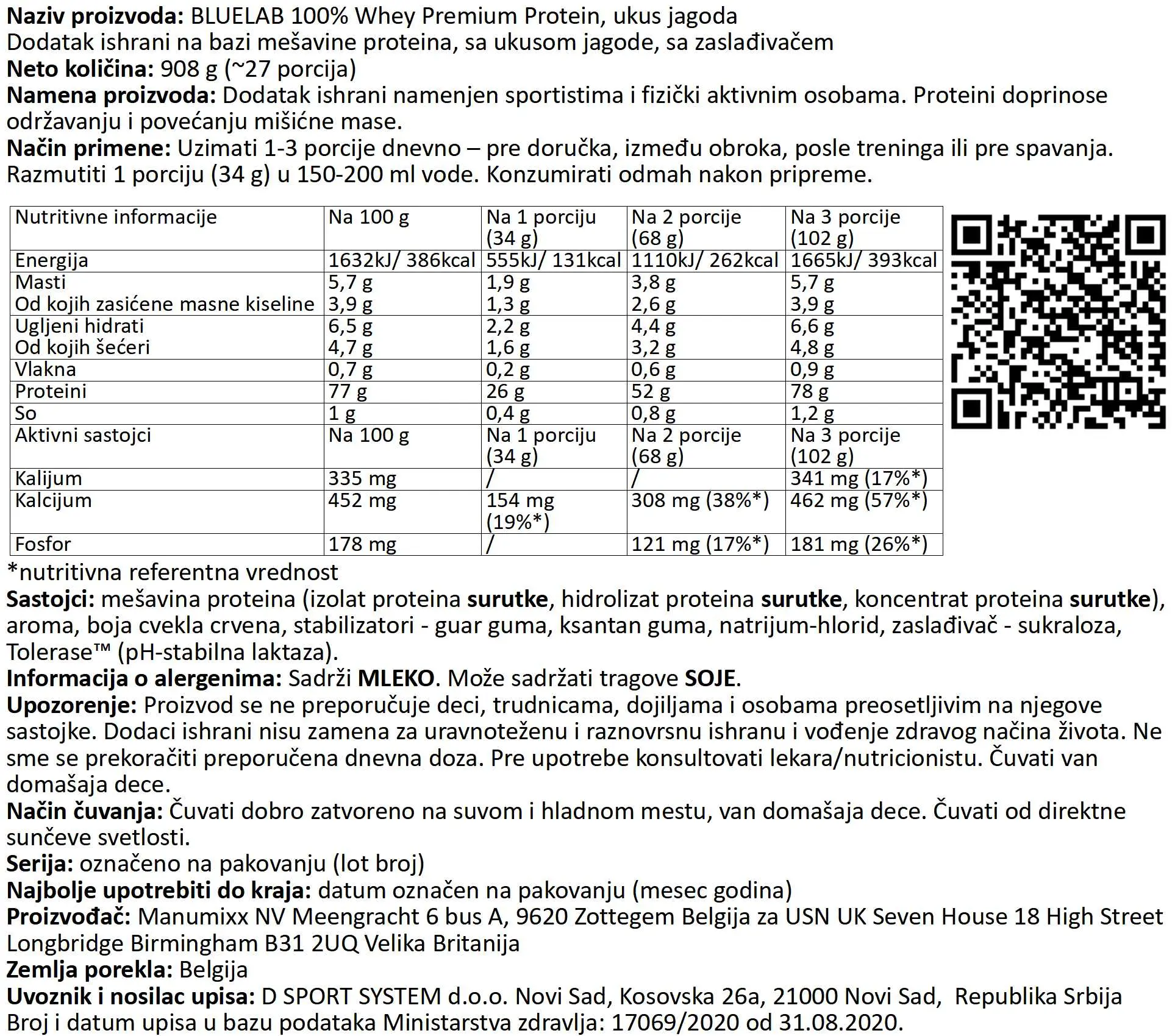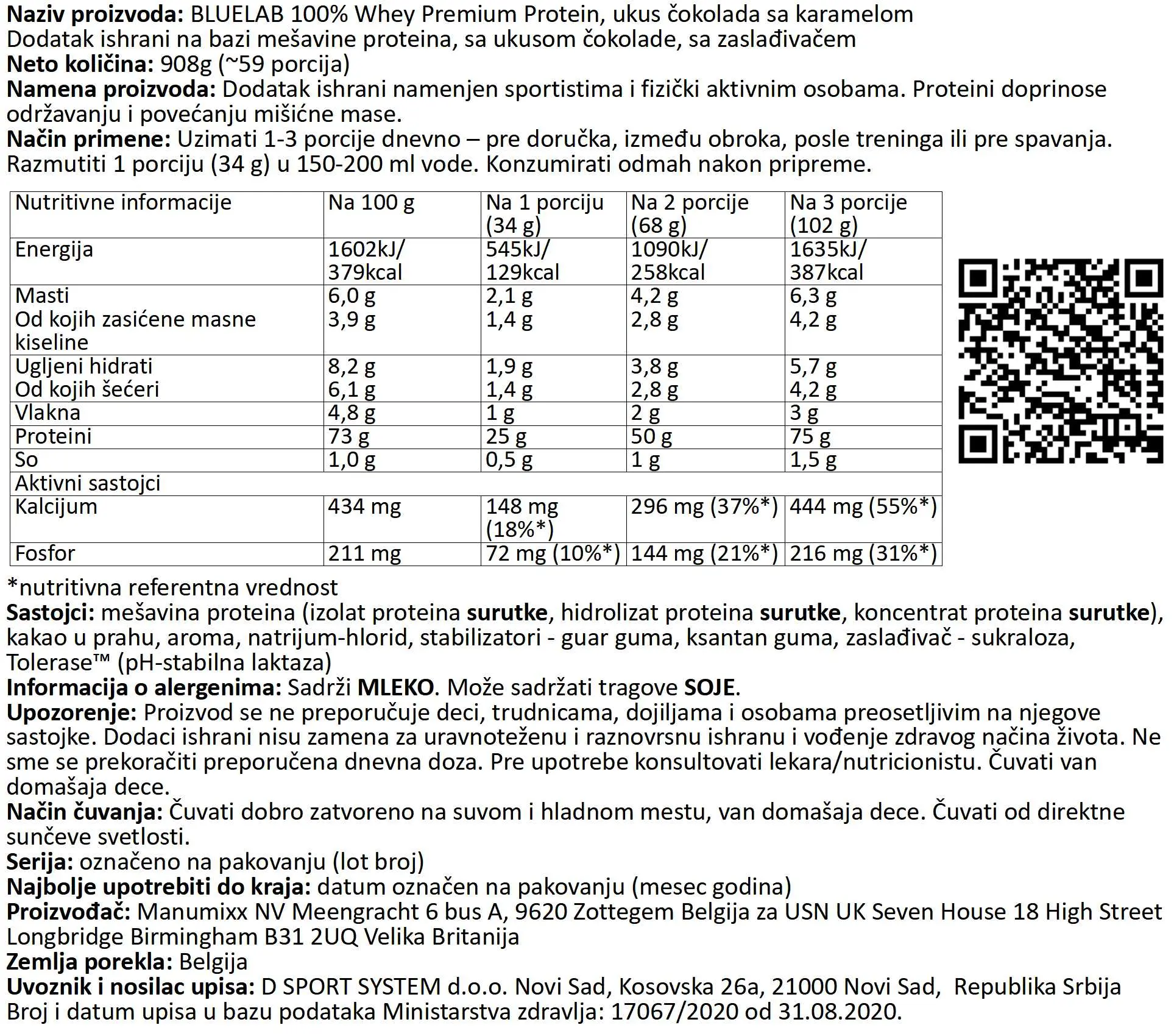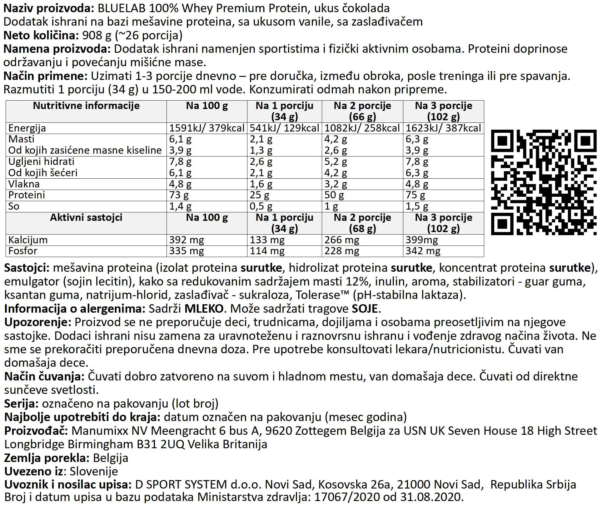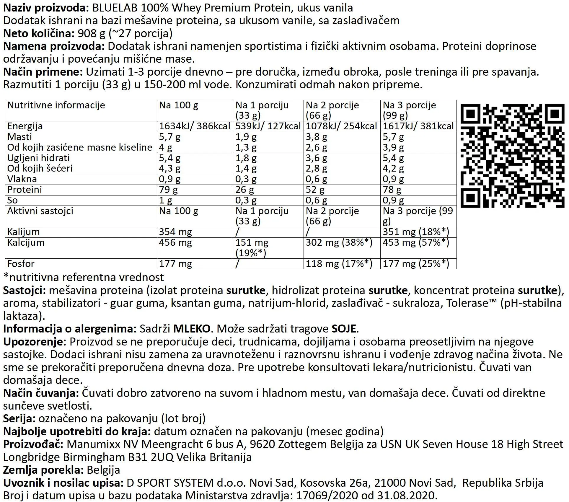 Nutritivna vrednost za USN BLUE LAB 100% WHEY PROTEIN, 908g