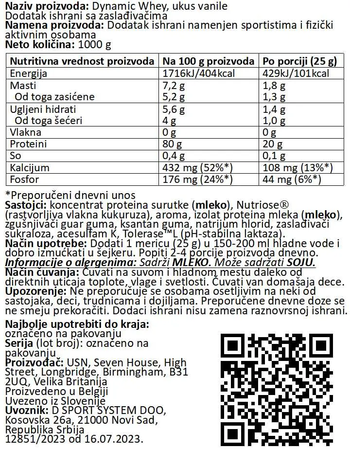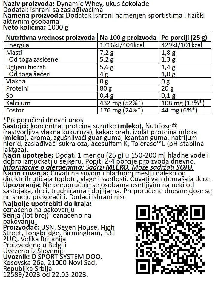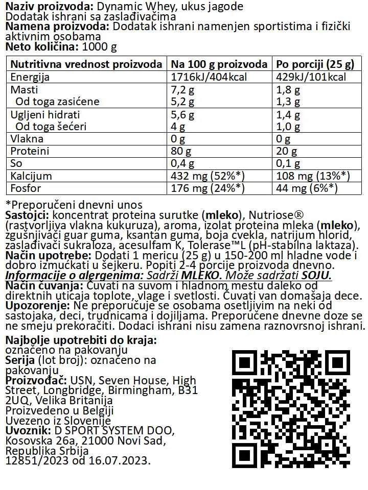 Nutritivna vrednost za USN DYNAMIC WHEY, 1000g