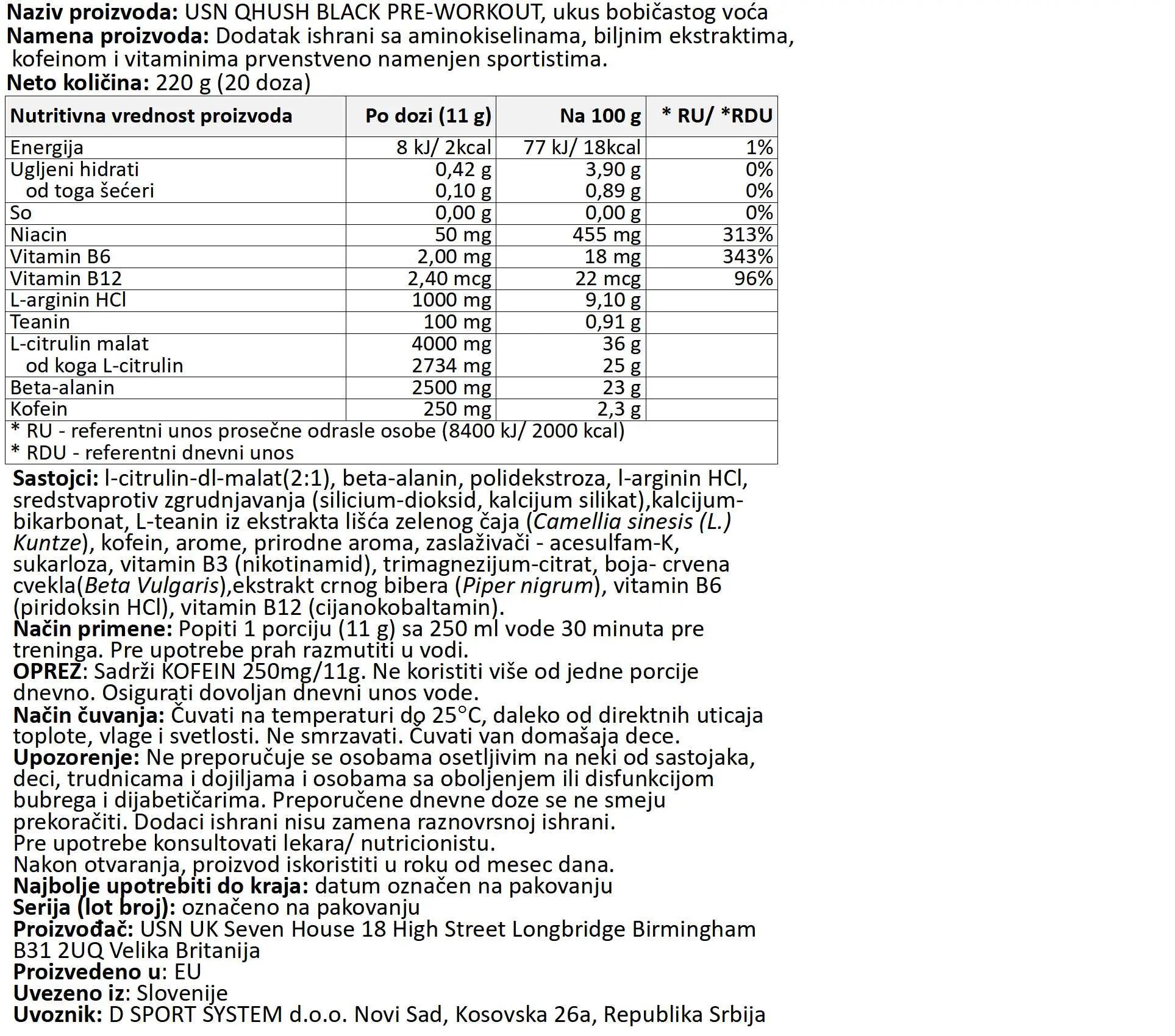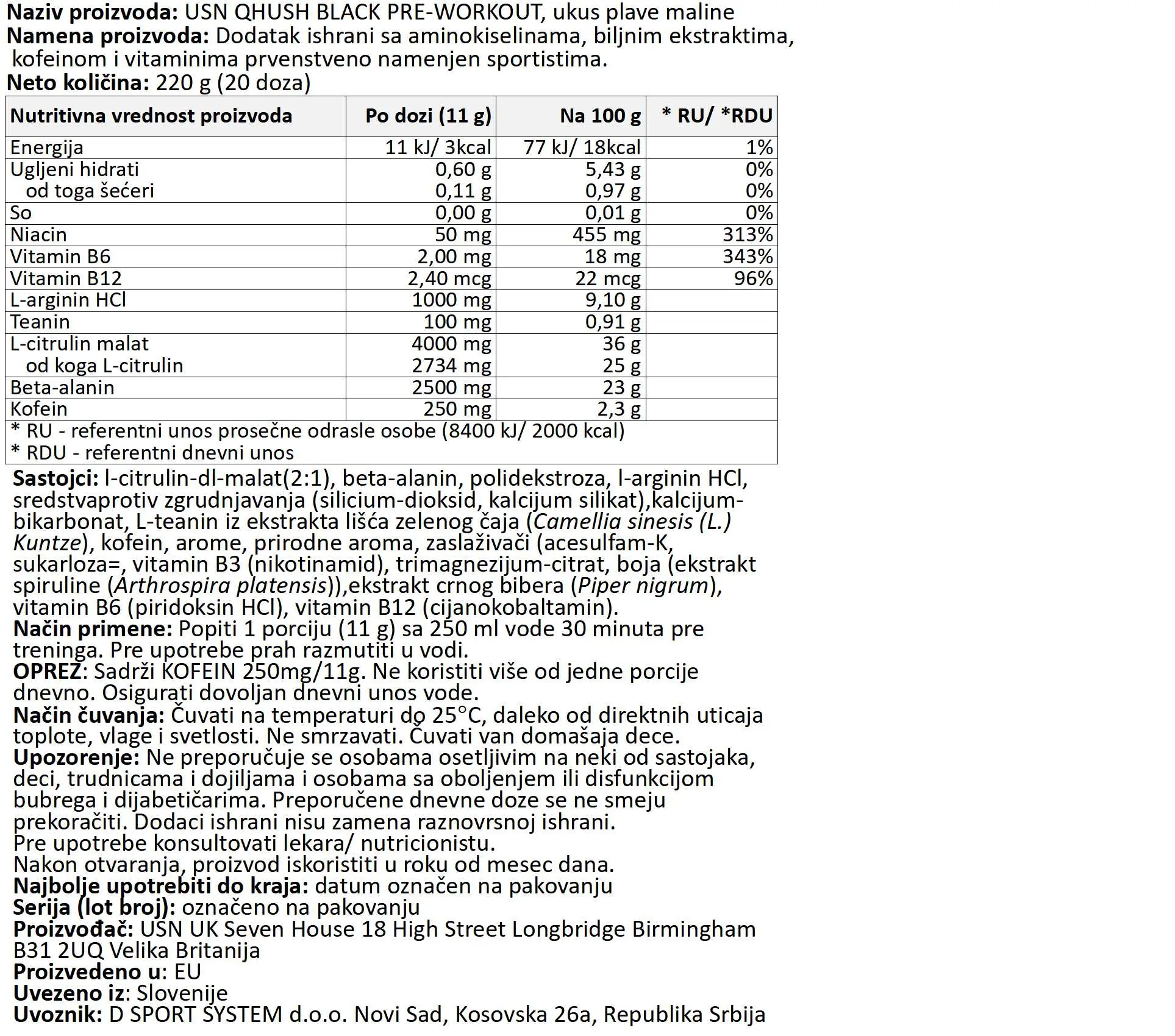 Nutritivna vrednost za USN QHUSH PRE-WORKOUT, 220g