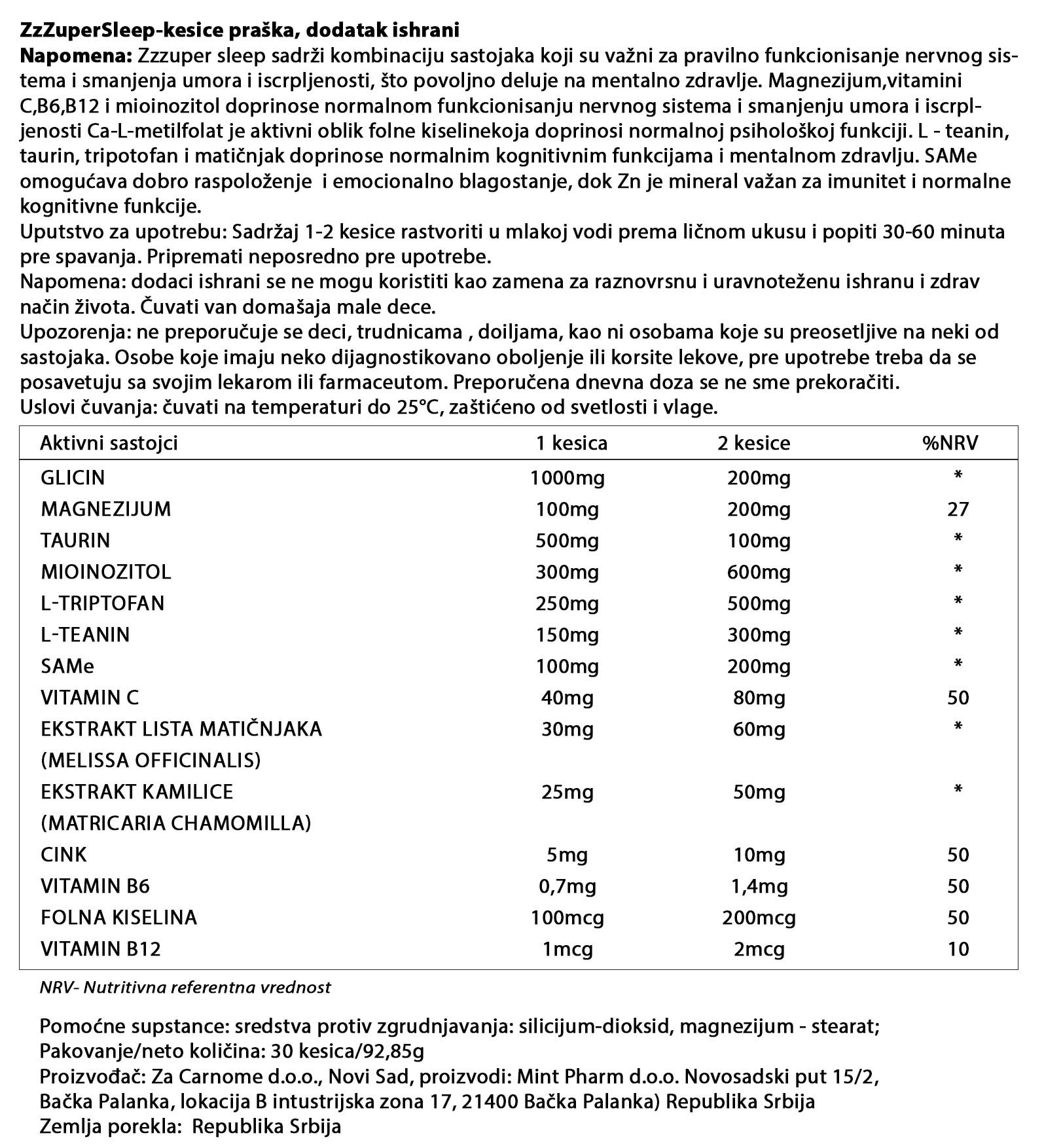 Nutritivna vrednost za Zzzuper Sleep, 30 kesica